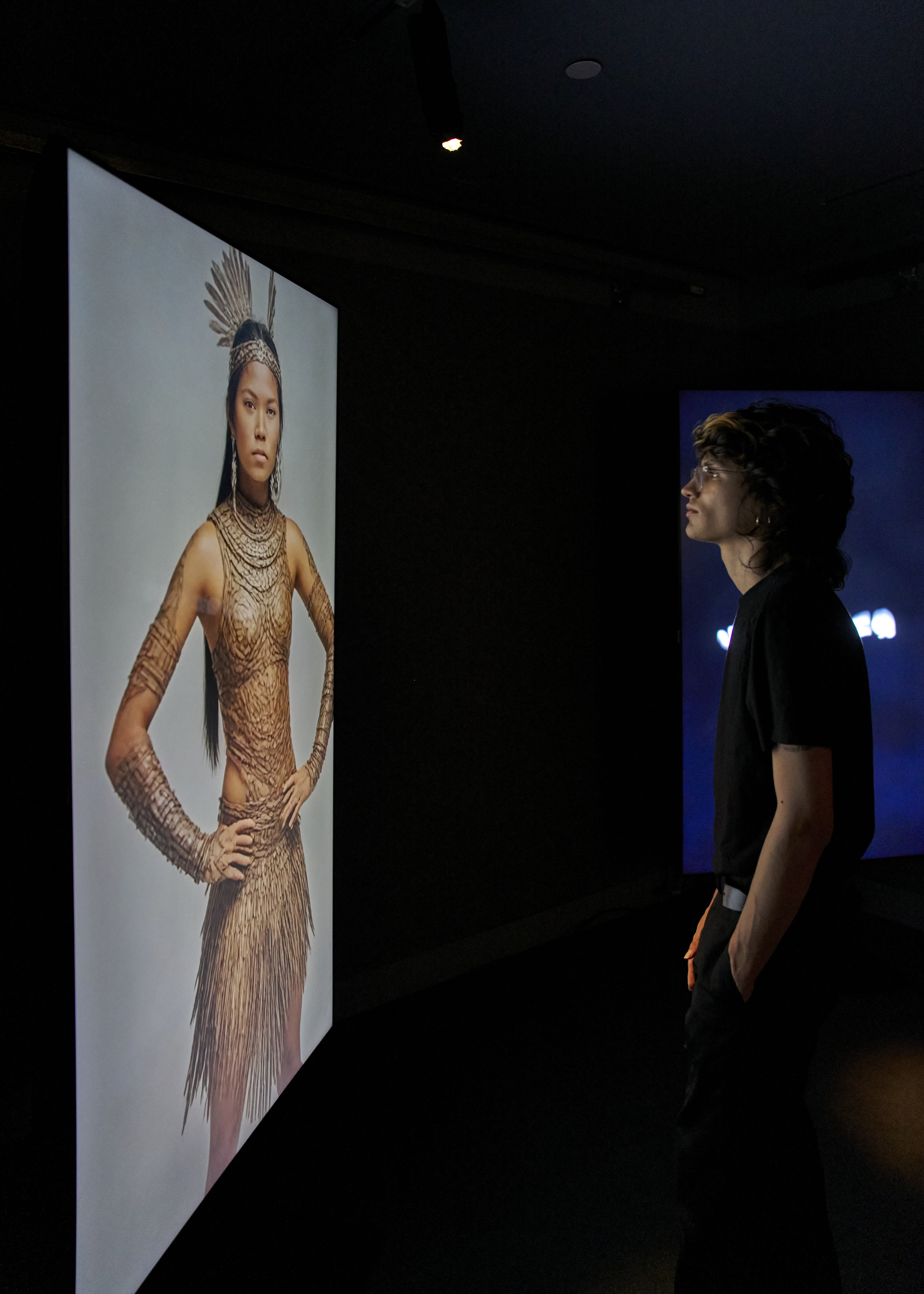 Kapwa is a visceral representation of the loss of Filipino culture and a demonstration of the grieving process itself. The installation uses generative A.I. to imagine elements of culture and history that are missing. In other words, Kapwa shows us images that feel familiar, but are ultimately false: prosthetic versions of irretrievable lost artifacts.