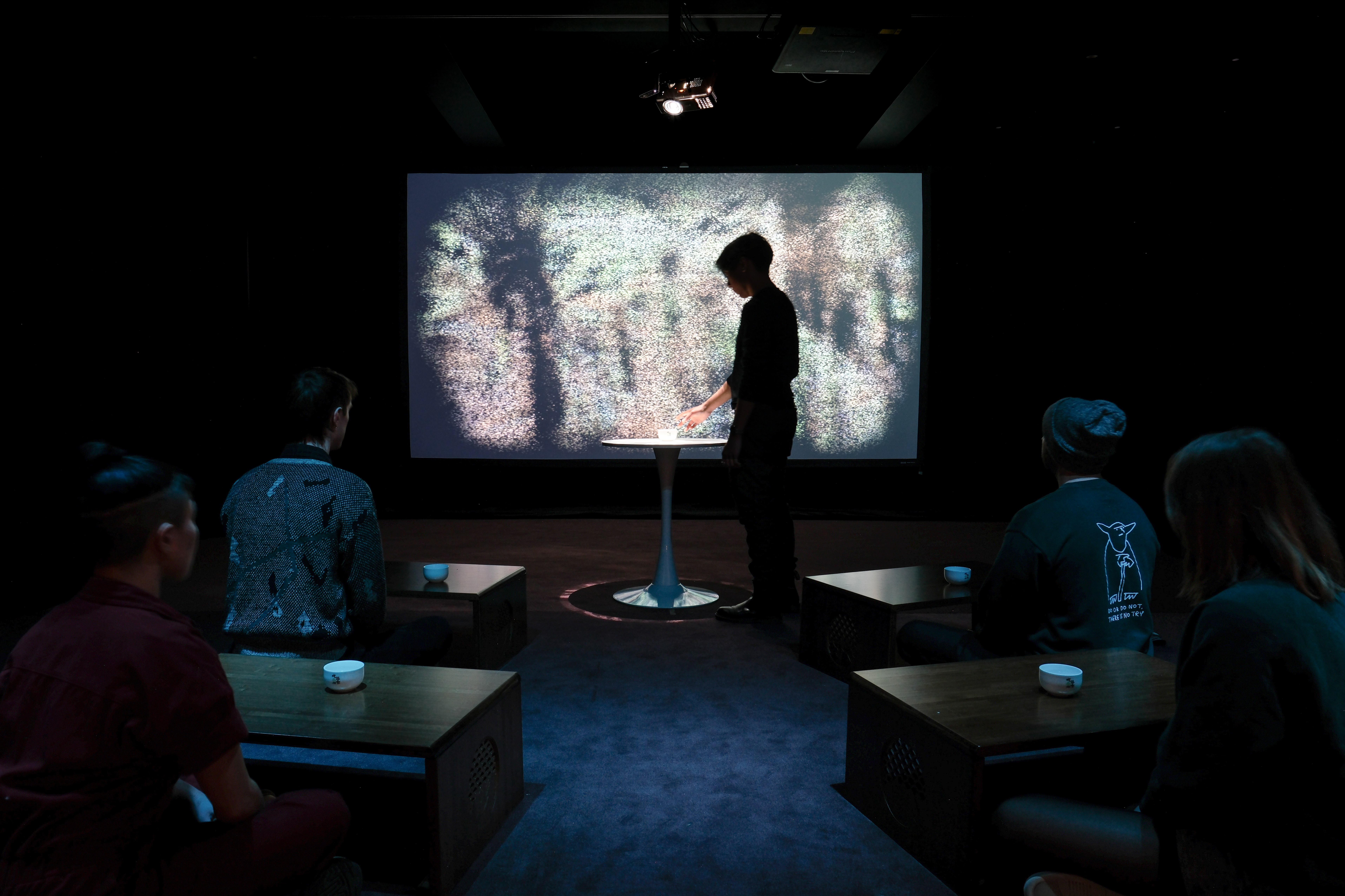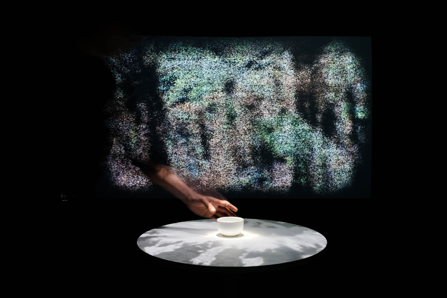 Visual artists Aaron Santiago and Michaela Ternasky-Holland have orchestrated a multi-sensory experience with the help of tea’s transformative quality as well as simulation technology. The collaborative duo has built a contemporary version of a traditional tea house where visitors can step in for a tea leaf fortune reading. Five types of Oolong tea from Taiwan’s Lishan Mountain is on offer, followed by relaxation on pillows at a darkened room where each participant can place their tea cup under a light projection to decode the meaning of their beverage’s leaves about their future. Moving abstract patterns mystically morph in a loop on a large wall projection, accompanied by a genderless voice’s premonitions. Be prepared, for example, for the AI’s constructive advice: “You stand on a threshold ready to break free from self-constrains.”